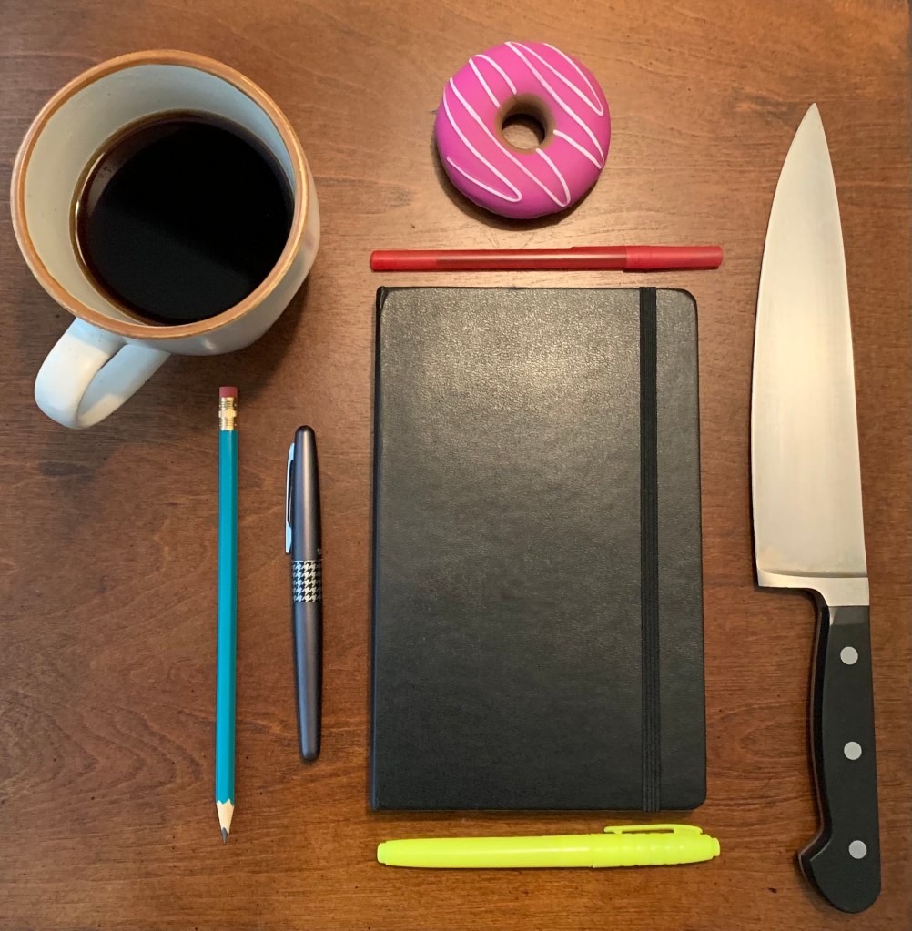 This is accomplished by using the appropriate implements of Tools of the Unburdening; a black pen for writing, a Red Pen of Doom for editing, a journal, and a fully sharp and tempered Blade of Cleaving.