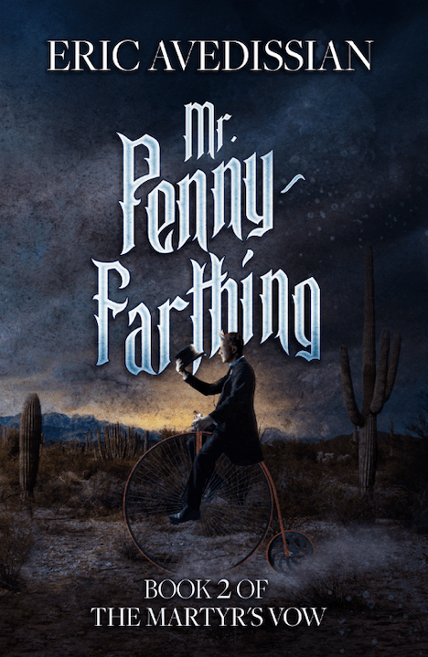 The official cover reveal for Mr. Penny-Farthing, the second book in The Martyr’s Vow series, is finally here! I’d like to thank the artist, Francois Vaillancourt for an unsettling cover illustration. There’s something disturbing about a man in Victorian garb riding a high-wheeled bicycle through the desert at night.